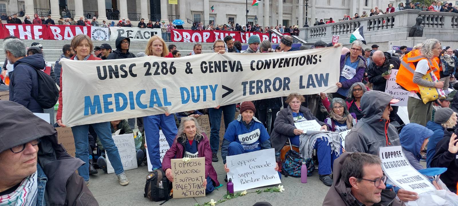 At least 7 health professionals were arrested today at the latest protest against the unprecedented proscription of Palestine Action, and the UK’s continued complicity in the genocide in Gaza and in solidarity with the Palestinian people. As before, placard holders sat in a peaceful vigil holding signs stating: “I oppose Genocide. I support Palestine Action”. Just before the vigil a banner displaying the same words was dropped from Westminster Bridge.